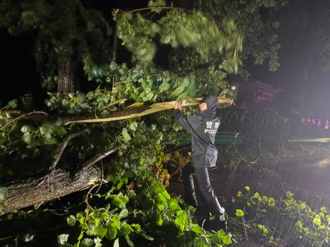7月17日凌晨,廬江縣突降暴雨,盛橋派出所民警清理被大風(fēng)刮倒的大樹(shù)。