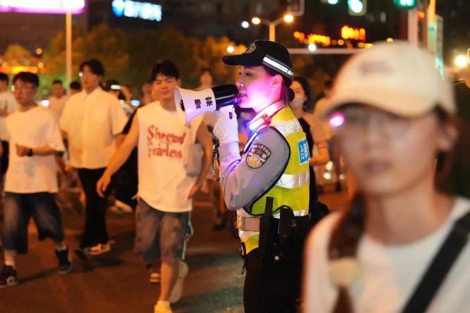 7月19日深夜,合肥體育中心外,演唱會(huì)散場(chǎng),交警堅(jiān)守崗位疏導(dǎo)交通,保數(shù)萬(wàn)觀眾平安返程。