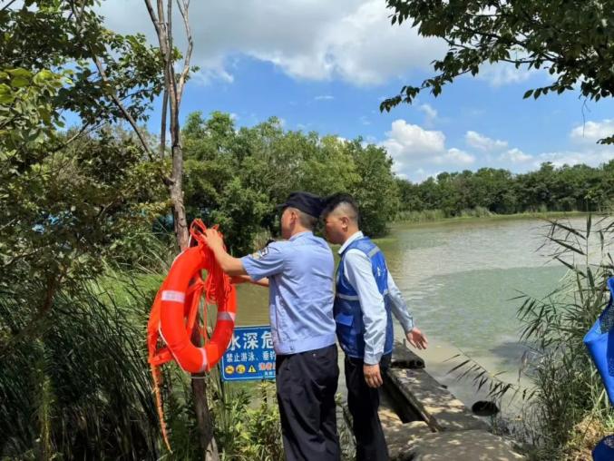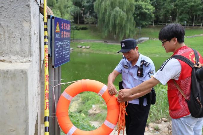 7月10日,廬江縣公安局崗灣派出所社區(qū)民警聯(lián)合志愿者,檢查轄區(qū)水域救援安全防護(hù)設(shè)施。