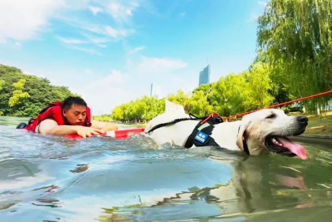 7月25日,蜀山分局巡警一大隊(duì)在天鵝湖組織水上救援演練,警犬Lucky拉“落水者”上岸。