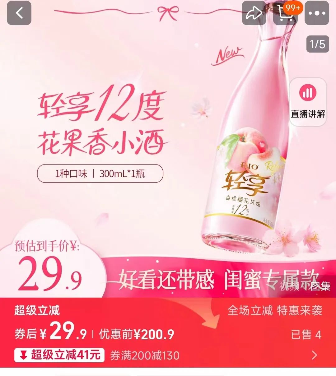 8月5日,RIO銳澳12度花果香小酒新品正式上市,有白桃櫻花、冰酒茉莉、金桂梅酒三種風(fēng)味,規(guī)格為300ml裝,并于當(dāng)日在線上渠道首發(fā)。時代財經(jīng)查詢發(fā)現(xiàn),天貓旗艦店已上架該產(chǎn)品,其中6瓶裝價格為129元,單瓶裝售價29.9元/瓶。