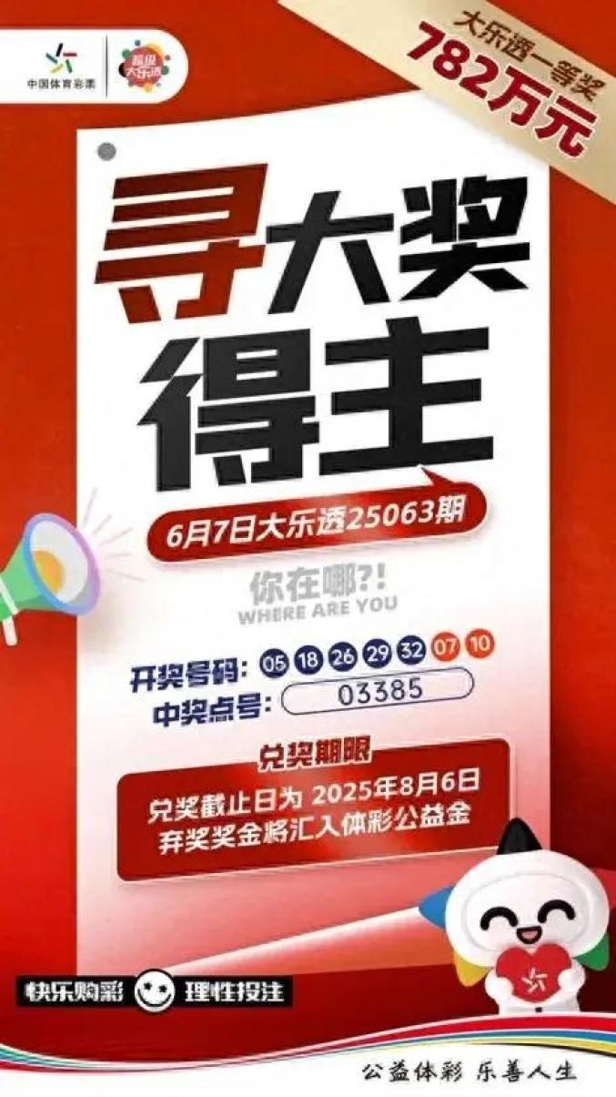 6月7日,中國體育彩票超級大樂透第25063期開獎,號碼為前區(qū)05 18 26 29 32,后區(qū)07 10。當期湖北武漢兩家銷售點各中1注一等獎,獎金高達782萬元。
