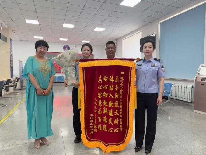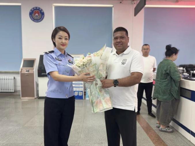 一位毛里求斯籍友人手捧鮮花,站在通遼市公安局出入境大廳,眼中的光芒比花束還要耀眼。