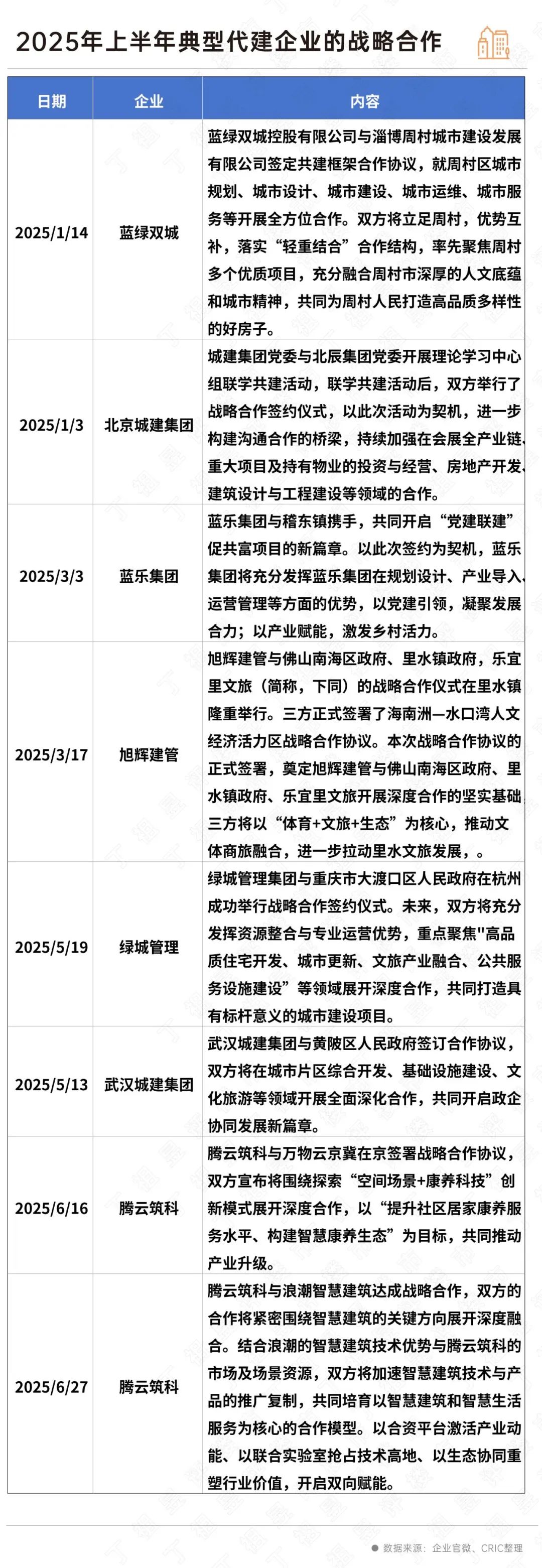 值得關(guān)注的是,2025年上半年,多家代建企業(yè)通過(guò)戰(zhàn)略簽約的方式深化代建業(yè)務(wù)布局,合作內(nèi)容呈現(xiàn)多元化。