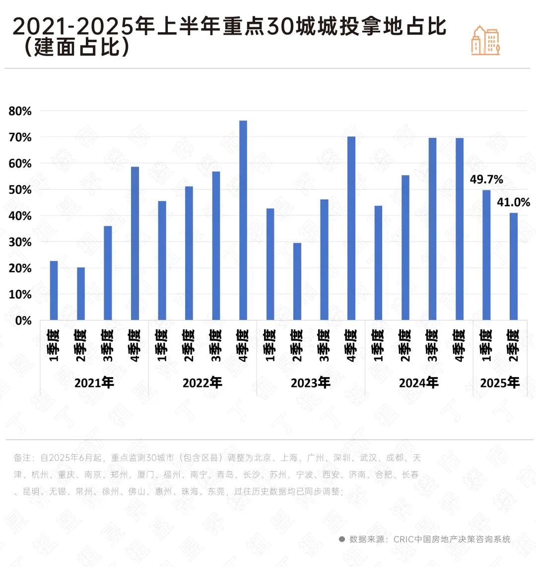 根據(jù)CRIC監(jiān)測(cè)的重點(diǎn)30城數(shù)據(jù)顯示,2025年上半年城投及平臺(tái)公司參與拿地的建面超過(guò)2200萬(wàn)平方米,較2024年上半年微增4%,占比為45%,較2024年上半年、2024年全年分別下降5個(gè)百分點(diǎn)和19個(gè)百分點(diǎn)。