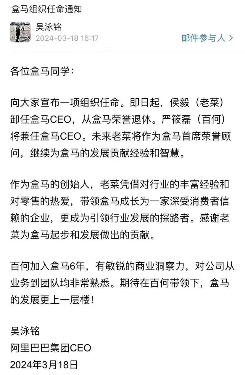回顧近年來的人事變動,2024年3月,創(chuàng)始人侯毅退休,這位從2015年就帶領(lǐng)團隊創(chuàng)立盒馬鮮生的“掌舵人”,見證了盒馬從誕生到成長的關(guān)鍵階段。