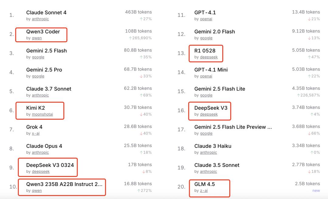 模型開放平臺OpenRouter統(tǒng)計(jì)顯示,2025年7月28日,Kimi K2全球模型調(diào)用量排第6,GLM - 4.5發(fā)布當(dāng)天沖到第20。