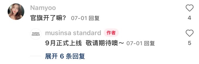 《聯(lián)商網(wǎng)》查閱發(fā)現(xiàn),MUSINSA以及Musinsa Standard目前都已入駐小紅書(shū),根據(jù)Musinsa Standard在筆記評(píng)論區(qū)的互動(dòng)信息,9月Musinsa Standard官方旗艦店將正式上線。