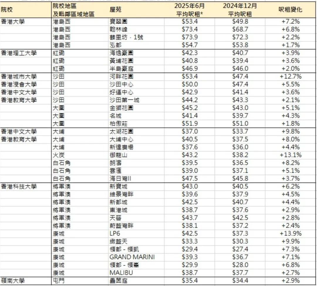 香港美聯(lián)物業(yè)消息顯示,與去年12月相比,今年6月香港八所公立大學(xué)附近受內(nèi)地學(xué)生喜愛的大型社區(qū),平均呎租均有不同程度上漲。像臨近香港城市大學(xué)的河畔花園、臨近香港教育大學(xué)的御龍山、臨近香港科技大學(xué)的日出康城6期等小區(qū),租金漲幅超10%。