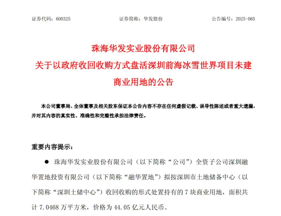 公告稱,公司子公司融華置地收到深圳土儲中心發(fā)來的函件,深圳土儲中心擬以44.05億元人民幣(含政府本次收回收購承擔的契稅)收回收購融華置地持有的前海冰雪世界項目7塊商業(yè)用地。