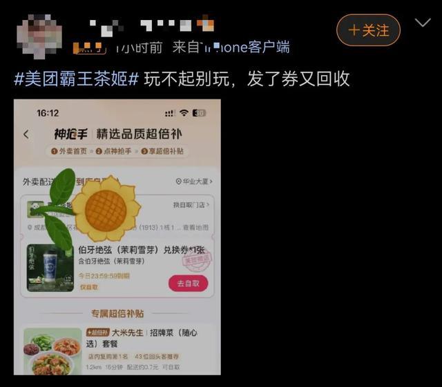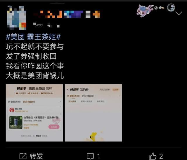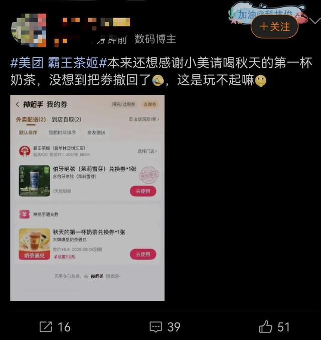 有網(wǎng)友吐槽:“本來(lái)還想感謝小美請(qǐng)喝秋天的第一杯奶茶,沒(méi)想到把券撤回了,這是玩不起嘛”