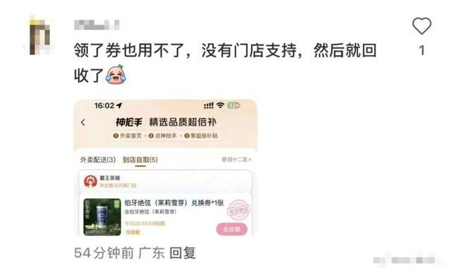 據(jù)悉,大量網(wǎng)友稱通過(guò)美團(tuán)“神搶手”活動(dòng)領(lǐng)取的霸王茶姬“伯牙絕弦”兌換券(價(jià)值17元),短時(shí)間內(nèi)被系統(tǒng)強(qiáng)制收回。部分用戶發(fā)現(xiàn)“附近暫無(wú)可取門(mén)店”,還有些用戶的券直接消失。