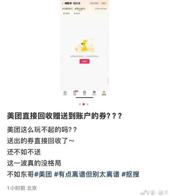 更有網(wǎng)友直言“不如東哥”:“美團(tuán)這么玩不起的嗎???送出的券直接回收了~還不如不送,這一波真的沒(méi)格局,不如東哥”。