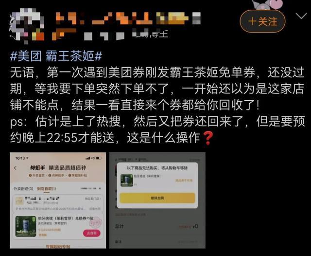 另一位網(wǎng)友抱怨:“無(wú)語(yǔ),第一次遇到美團(tuán)券剛發(fā)霸王茶姬免單券,還沒(méi)過(guò)期,等我要下單突然下單不了,一開(kāi)始還以為是這家店鋪不能點(diǎn),結(jié)果一看直接來(lái)個(gè)券都給你回收了!ps:估計(jì)是上了熱搜,然后又把券還回來(lái)了,但是要預(yù)約晚上22:55才能送,這是什么操作?”