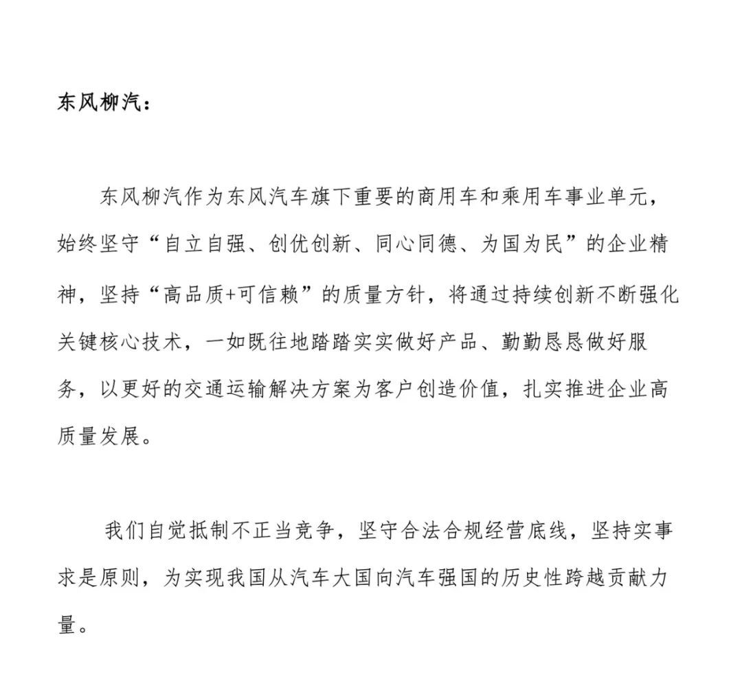 東風柳汽稱,將堅持“高品質+可信賴”的質量方針,通過持續(xù)創(chuàng)新強化關鍵核心技術,以更好的交通運輸解決方案為客戶創(chuàng)造價值,推動企業(yè)高質量發(fā)展。同時強調,自覺抵制不正當競爭,堅守合法合規(guī)經營底線,堅持實事求是原則,為我國從汽車大國向汽車強國的跨越貢獻力量。