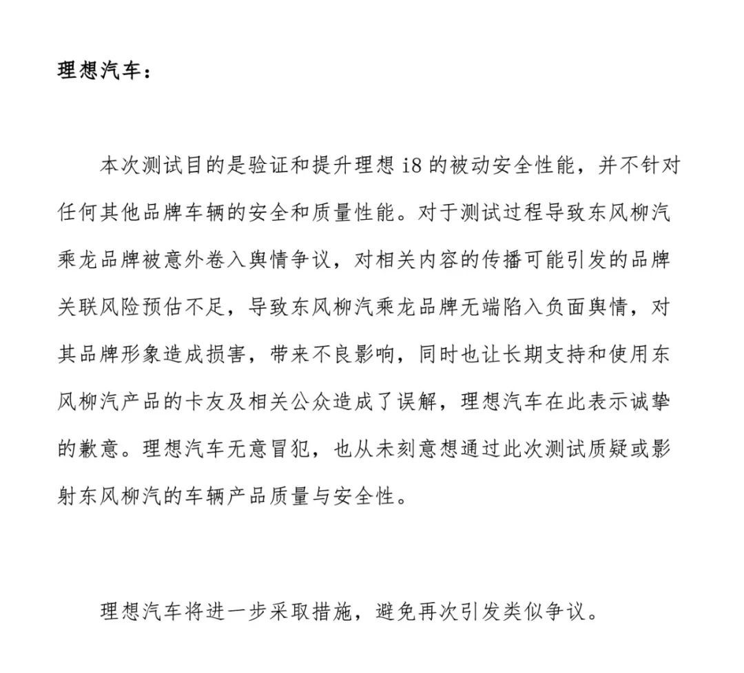理想汽車表示,此次測試目的是驗證和提升理想i8的被動安全性能,并非針對其他品牌車輛的安全和質量性能。但理想汽車承認,對測試過程中可能引發(fā)的品牌關聯風險預估不足,導致東風柳汽乘龍品牌形象受損,為此向其誠摯致歉,并承諾采取措施避免類似爭議再次發(fā)生。