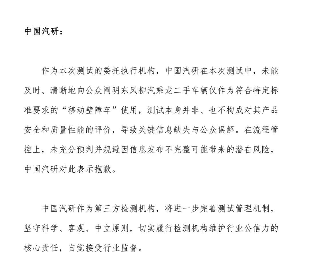 中國汽研作為測試的委托執(zhí)行機構,承認在測試中未能及時、清晰地向公眾說明東風柳汽乘龍二手車僅作為符合特定標準要求的“移動壁障車”使用,測試本身并非、也不構成對其產品安全和質量性能的評價,這導致關鍵信息缺失,引發(fā)公眾誤解。中國汽研對此表示歉意,并承諾完善測試管理機制,堅守科學、客觀、中立原則,切實履行檢測機構維護行業(yè)公信力的核心責任。
