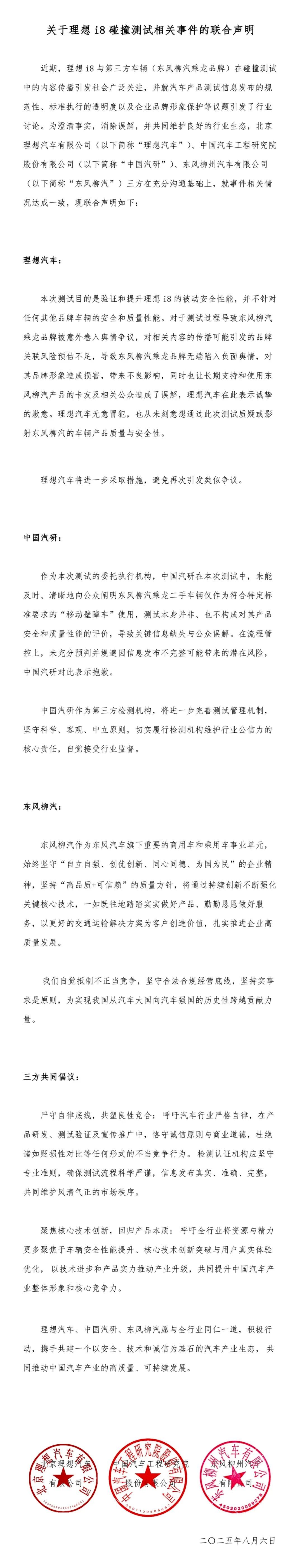 持續(xù)近一周的理想i8與乘龍卡車對撞測試爭議,或許即將迎來大結局。8月6日,理想汽車、中國汽研與東風柳汽(乘龍卡車)發(fā)布聯合聲明,這或許會為此次事件畫上句號。