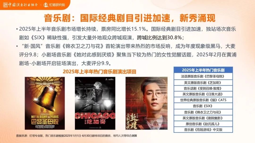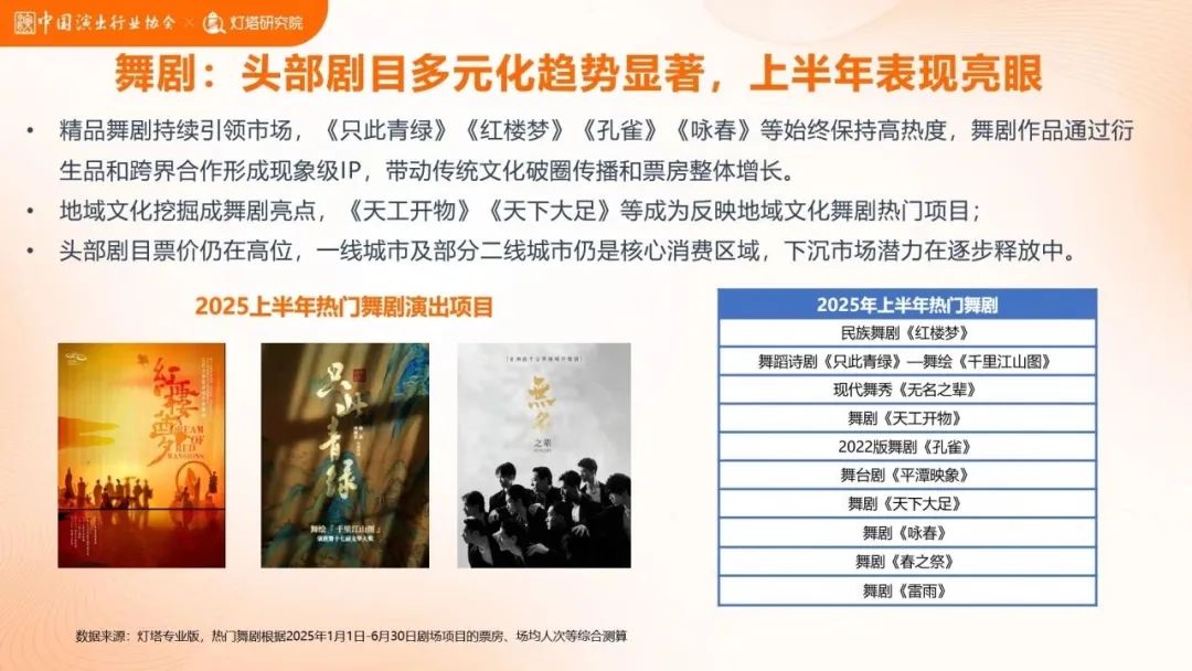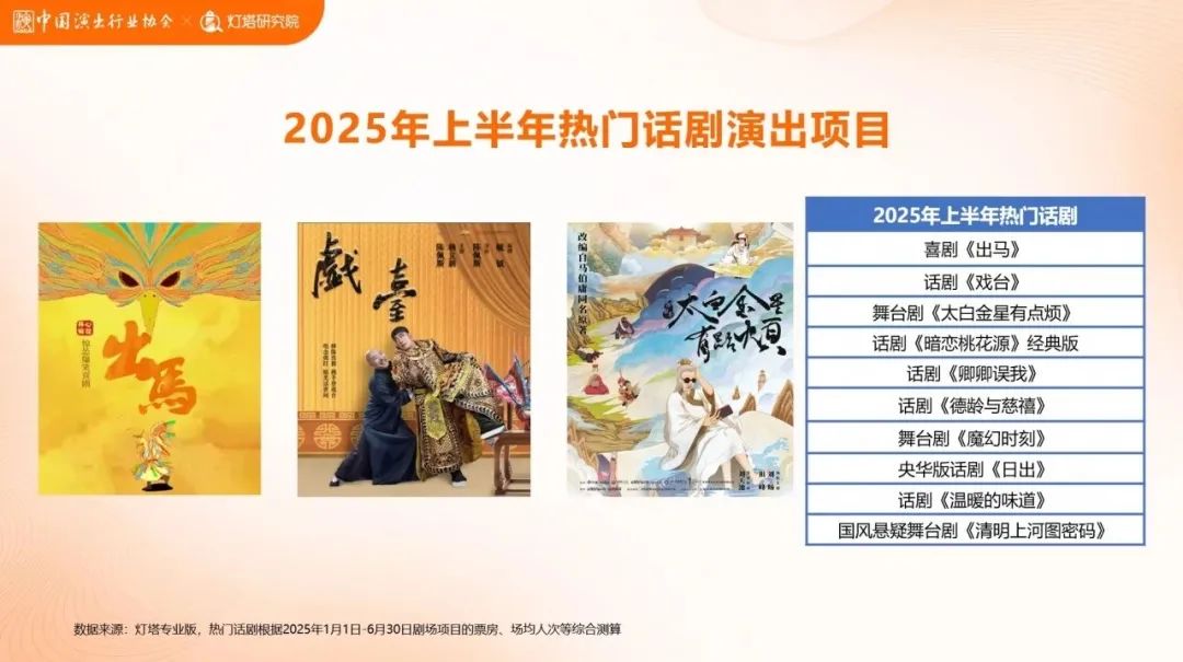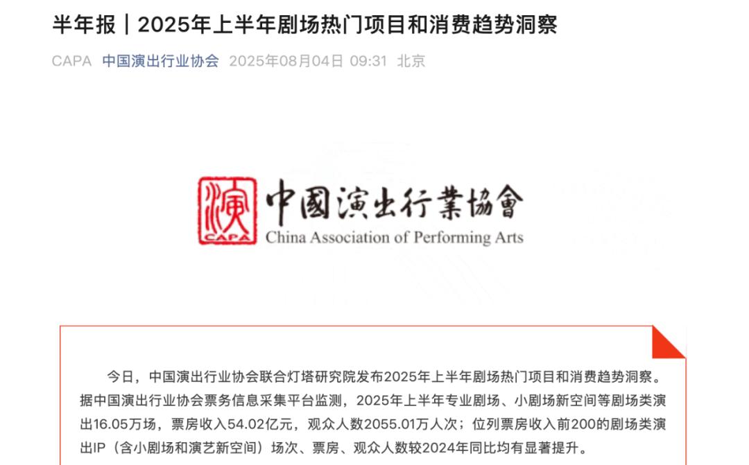 以上這個(gè)消費(fèi)趨勢,推動2025劇場類演出市場迎來大爆發(fā)。8月4日中國演出行業(yè)協(xié)會聯(lián)合燈塔研究院發(fā)布了《2025年上半年劇場熱門項(xiàng)目和消費(fèi)趨勢洞察》,用“漲勢迅猛”四個(gè)字形容其市場表現(xiàn)毫不為過——