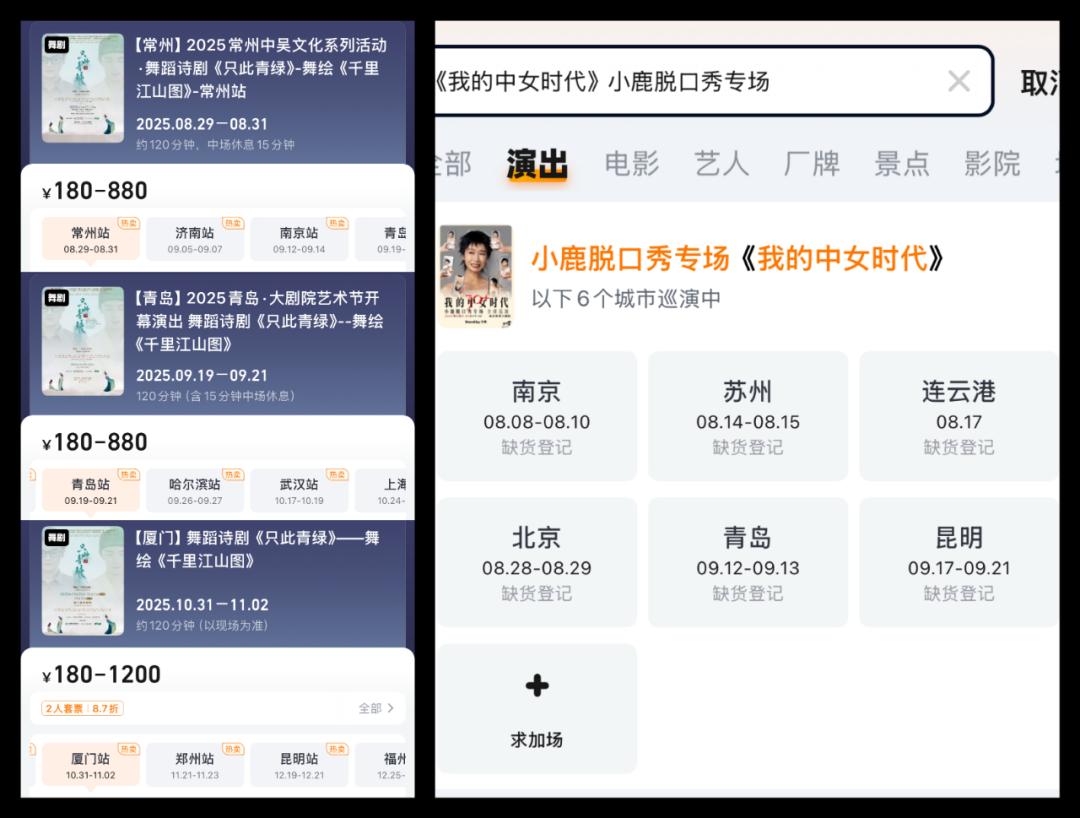 犀牛君有個(gè)小觀察,這市場越來越熱的一大證據(jù)是,2025上半年有很多的爆款I(lǐng)P演出正在“殺”向全國各地的大小城市。像精品舞劇《只此青綠》今年接連去到了衡陽、寧波、常州、青島、廈門等較低線城市火熱巡演;脫口秀演員小鹿的新專場《我的中女時(shí)代》則深入到了省會城市濟(jì)南、武漢、太原以及連云港、蘇州、青島等非省會城市“全國開花”。