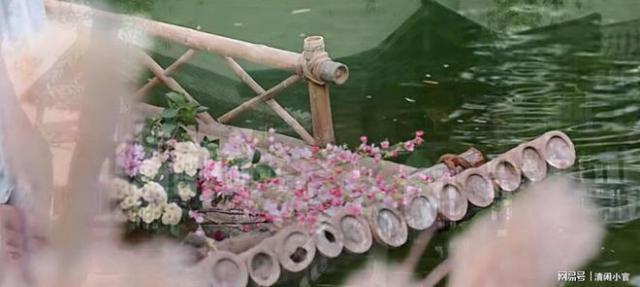 竹筏上鮮花綻放,滑進鏡頭,粉嫩的花色與碧綠的青水相得益彰。