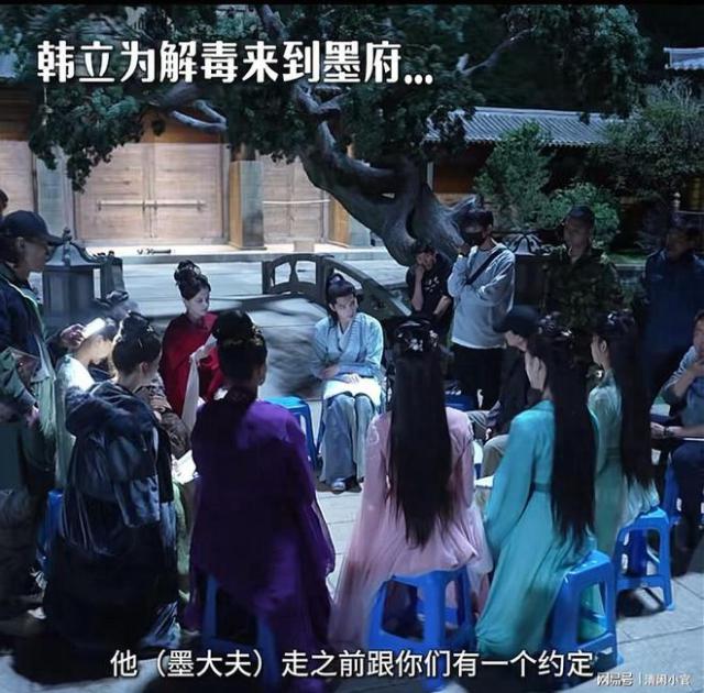 韓立為解毒來到墨府的群像戲份中,眾人圍圈對臺詞,導(dǎo)演站在他們身后進行指導(dǎo)。
