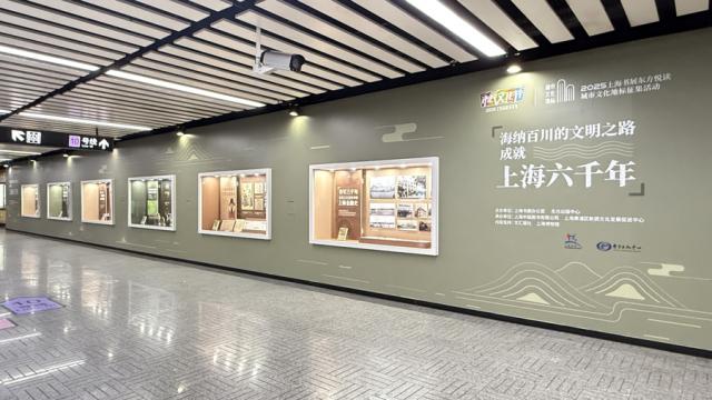 當(dāng)早高峰的人潮涌入新天地站,“上海六千年文化長廊”在10號線與13號線交匯的換乘通道亮相,靜候乘客駐足。這條通勤路上的“文化長廊”,由上海書展辦公室與東方出版中心打造,文匯報社與上海博物館提供專業(yè)內(nèi)容支持,以《上海六千年:海納百川的文明之路》一書為敘事核心,用六大主題板塊編織出可觸摸、可感知的城市史詩。
