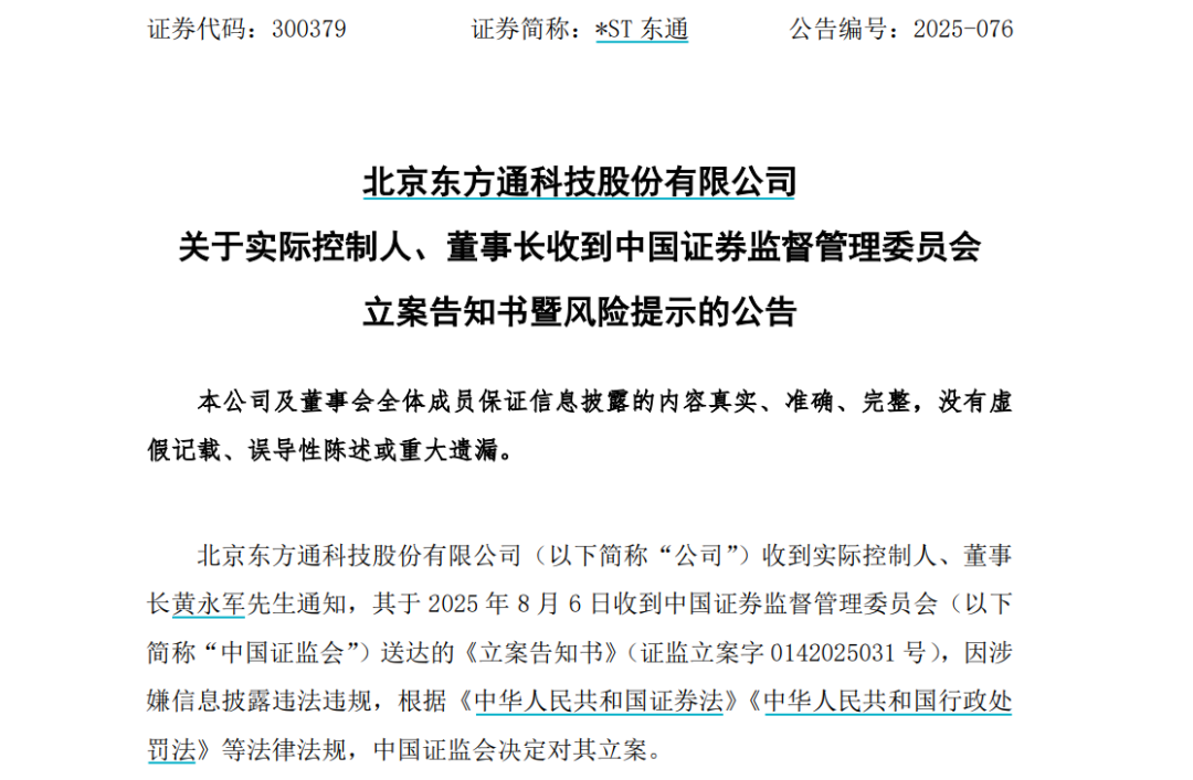 8月6日晚間,*ST東通發(fā)布公告稱,公司實際控制人、董事長黃永軍因涉嫌信息披露違法違規(guī),于2025年8月6日收到中國證監(jiān)會的《立案告知書》,被中國證監(jiān)會立案。