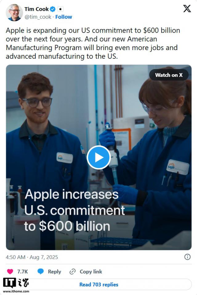 IT之家8月7日消息,蘋果公司今日宣稱,會把在美國制造業(yè)的投資提升至6000億美元(IT之家注:現(xiàn)匯率約合4.31萬億元人民幣)。這是在今年早些時候承諾的四年內(nèi)在美國投入5000億美元的基礎上,再追加1000億美元。