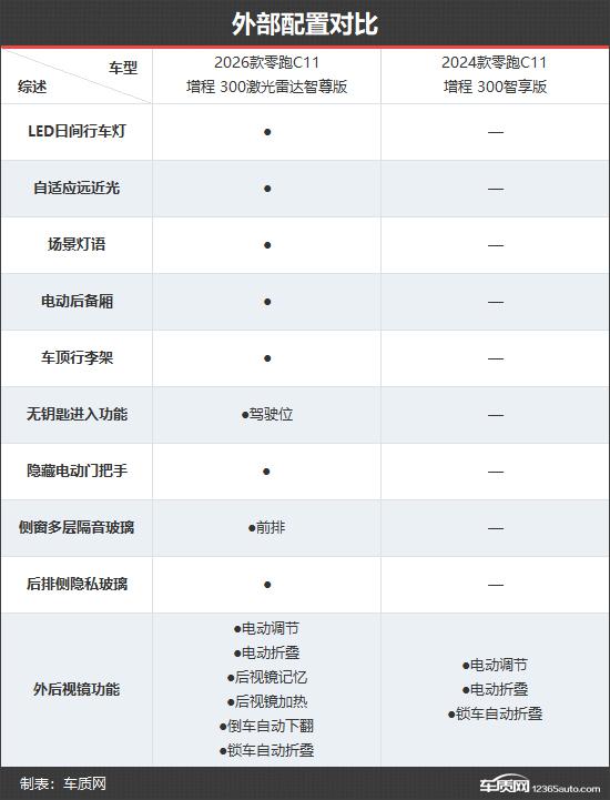 2026款零跑C11推出5款配置車型,有增程式和純電動兩種動力,售價在14.98 - 16.58萬元。雖然入門門檻略有提高,但頂配版價格比老款更親民,車型數(shù)量也有所精簡。本次對比選擇價格相近的車型,以便更直觀地看出新老款在配置上的差異。