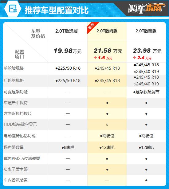 全系車型中,我們最推薦指導價21.58萬元的2.0T致尚版。相比低一級車型,推薦車型有更炫酷的熏黑輪轂和前布雷博紅色四活塞卡鉗,顏值更高且剎車性能更好,還有方向盤換擋撥片,提升了駕駛樂趣。車內(nèi)配置上,增加了駕駛位電動座椅記憶功能、車內(nèi)PM2.5過濾裝置,揚聲器數(shù)量達12個,讓用戶用車更便捷舒適。多花1.6萬元,非常值得。