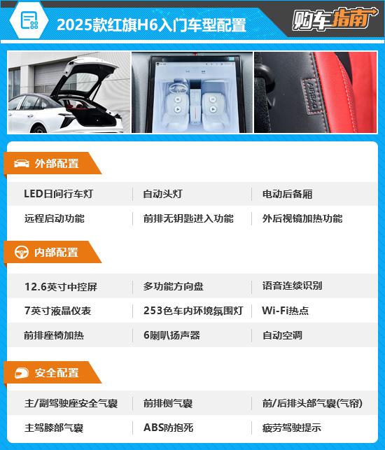 2025款紅旗H6的入門車型是2.0T致行版,售價17.98萬元。該車型有電動后備廂、前排無鑰匙進入等便捷配置,也配備了前排座椅加熱、自動空調(diào)等舒適性配置,基本能滿足日常使用。不過,入門版車型的主動安全配置不足,在運動氛圍和性能表現(xiàn)上與推薦車型差距明顯,所以不做主要推薦。