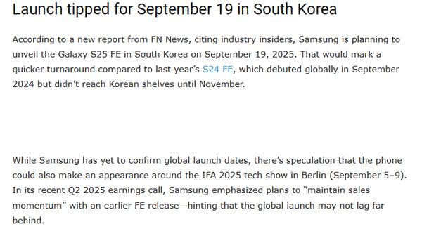 【CNMO 科技消息】據韓國媒體 FN News 援引行業(yè)內部消息,三星打算在2025年9月19日于韓國本土正式推出其最新款粉絲版旗艦手機——S25 FE。這一發(fā)布時間相較于去年S24 FE的上市節(jié)奏明顯提前,S24 FE雖在2024年9月全球亮相,但在韓國本土市場直到11月才正式發(fā)售。