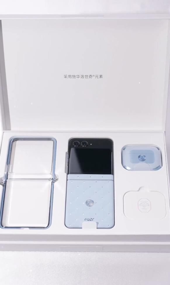 從視頻可以看到,該禮盒內(nèi)包含一部聯(lián)想moto razr 60冰鉆限定版手機(jī)、手機(jī)殼,還有聯(lián)想moto buds Clip耳機(jī)冰鉆版。