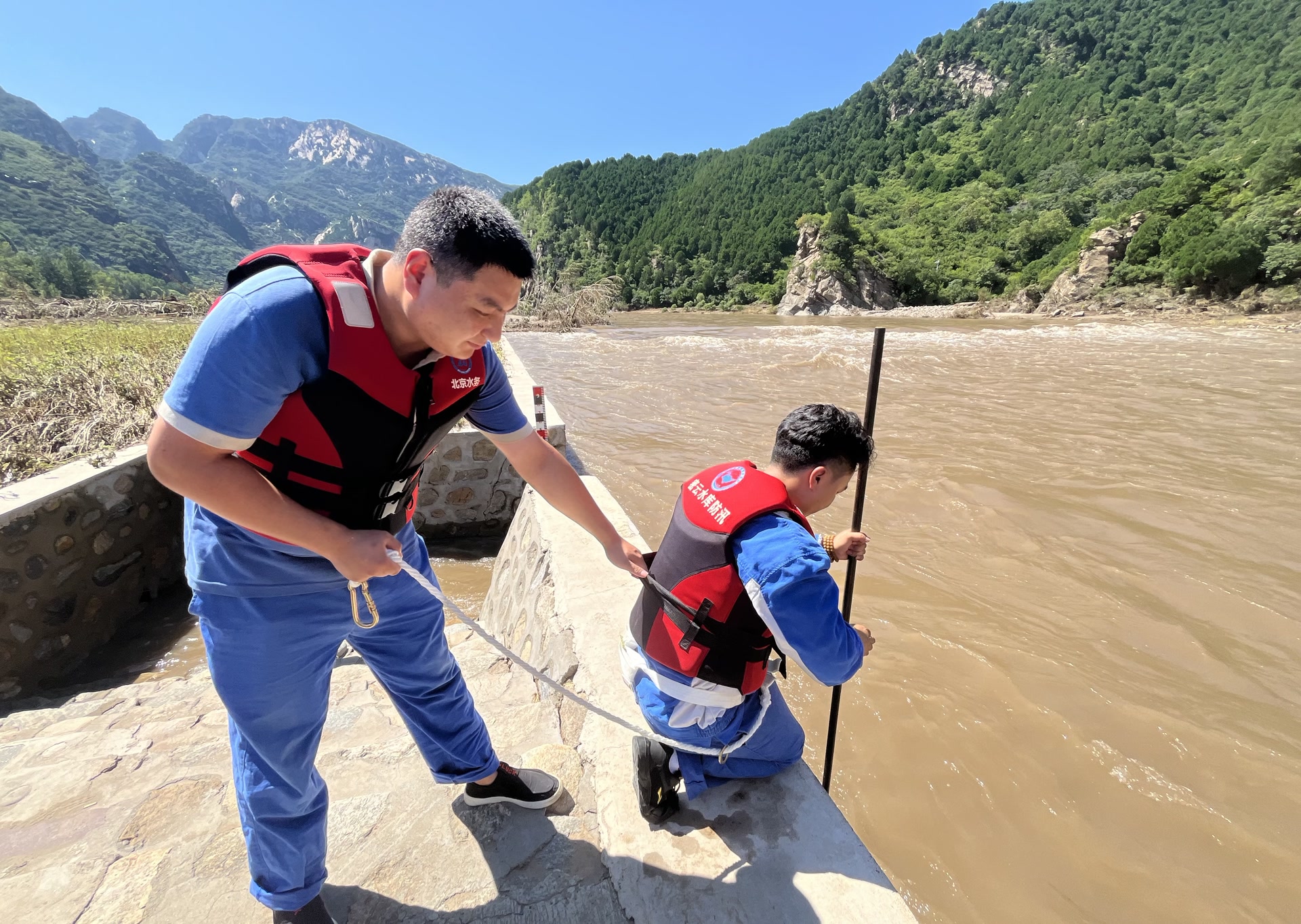 清水河是密云水庫上游潮河的一級支流。7月28日凌晨,工作人員發(fā)現(xiàn)前方探頭看不見了,提前布置的傳感器可能已被洪水沖毀,導(dǎo)致現(xiàn)場數(shù)據(jù)無法回傳,只能依靠人工勘測。