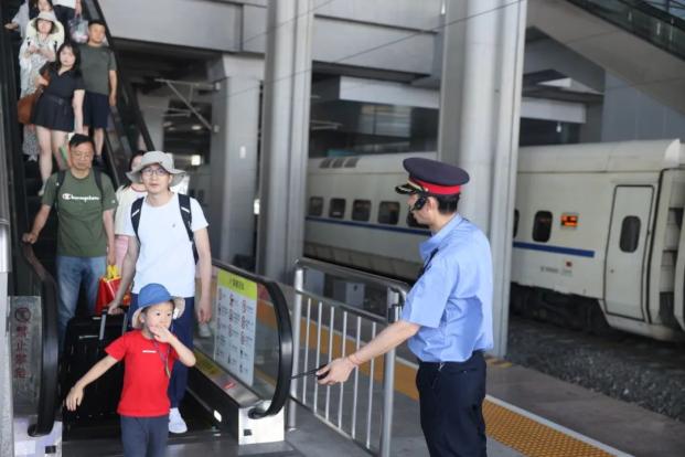 在滾滾熱浪與如織客流中,客運(yùn)值班員在站臺間來回穿梭,耐心引導(dǎo)、答疑、幫扶。他們用汗水見證堅(jiān)守,用服務(wù)詮釋初心。