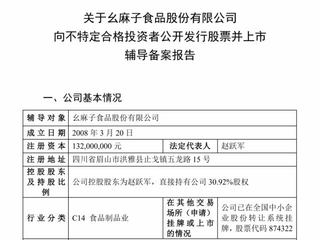 瑞財經(jīng) 劉治穎 8月5日,幺麻子食品股份有限公司(以下簡稱:幺麻子)在四川證監(jiān)局完成上市輔導備案登記,輔導券商為中金公司,律師事務(wù)所為北京市君合律師事務(wù)所,會計師事務(wù)所為信永中和會計師事務(wù)所。