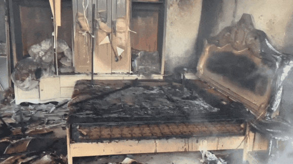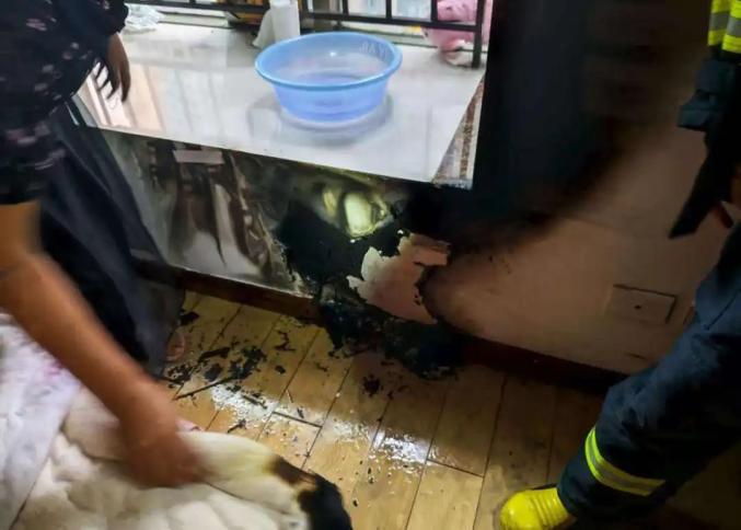 消防員趕到現(xiàn)場(chǎng)時(shí),明火已被住戶用盆潑水撲滅,但臥室內(nèi)部分墻面被熏黑,被褥過(guò)火燒損。