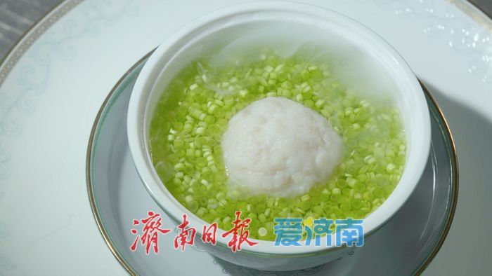 傳統(tǒng)的淮揚獅子頭在陳葉強的手中有了新的變化。他大膽地加入濟南本地食材,選用章丘大蔥的清甜和大明湖白蓮藕的脆嫩,關(guān)鍵是用黑虎泉水代替了常用的高湯。用泉水清燉能最大程度地展現(xiàn)食材的原汁原味,獅子頭入口松軟如云朵,食物的鮮美被泉水激發(fā)出來,像清泉一樣在舌尖流淌,鮮美而不油膩,讓人回味無窮。這道“泉水白玉獅子頭”是濟南凱賓斯基云泉中餐廳的主廚創(chuàng)意菜之一。