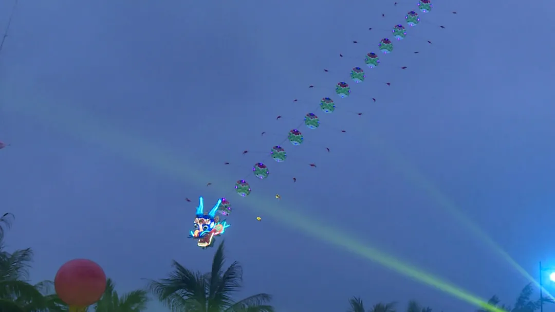 當(dāng)晚7點(diǎn)左右,螺洲海濱公園上空,兩條氣勢(shì)雄渾的傳統(tǒng)長(zhǎng)龍風(fēng)箏率先劃破暮色。它們周身布滿細(xì)密的 LED 光源,在放飛手熟練的操控下,長(zhǎng)龍?jiān)谝箍罩休p盈舞動(dòng),五彩的光芒清晰地勾勒出龍身威嚴(yán)的輪廓,宛如真龍降臨,栩栩如生。隨后,四款造型獨(dú)特的串飛板子類風(fēng)箏也緩緩升入空中,獨(dú)特的設(shè)計(jì)和靈動(dòng)的姿態(tài)帶來(lái)了強(qiáng)烈的視覺(jué)沖擊。