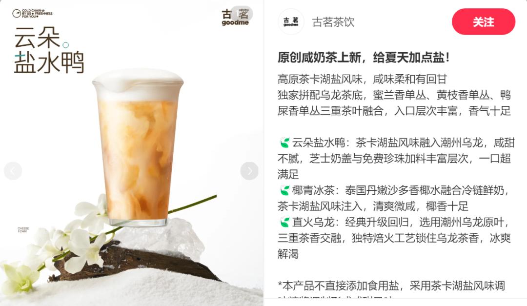 8月1日,古茗推出“原創(chuàng)咸奶茶”系列,將咸味元素引入茶飲。系列產(chǎn)品包括云朵鹽水鴨、椰青冰茶和直火烏龍三款,采用茶卡湖鹽風(fēng)味調(diào)味糖漿,打造“咸味柔和有回甘”的獨(dú)特口感。