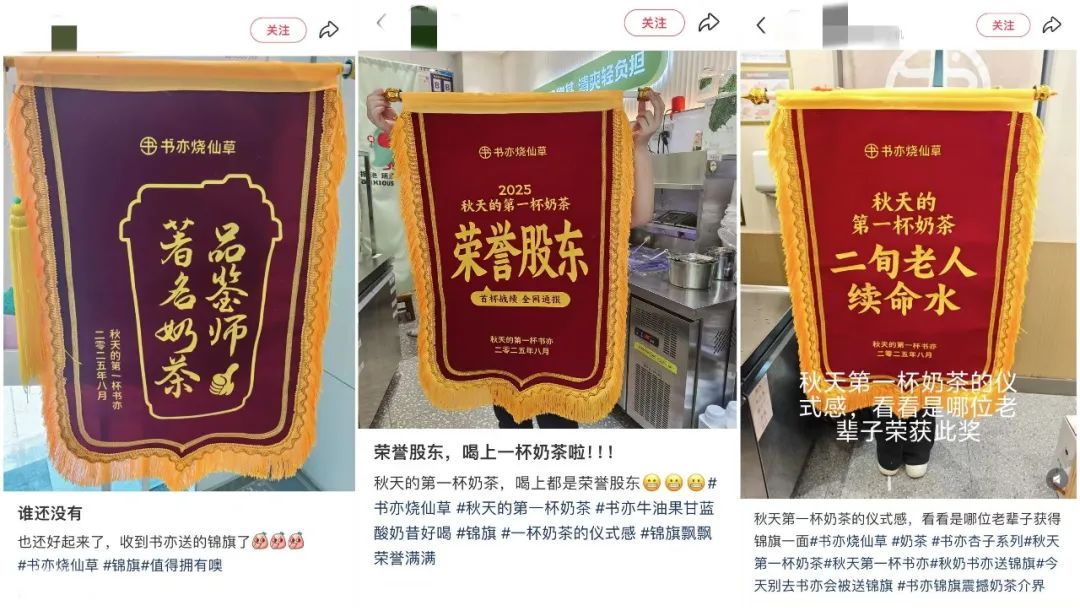除了送黃金,還有一些獨(dú)特玩法。書亦燒仙草玩起“榮譽(yù)認(rèn)證”,立秋當(dāng)天,各門店的“001號”訂單顧客會收到一面“巨型秋奶錦旗”。紅綢面上印著“二旬老人續(xù)命水”“開啟牛馬假日”“著名奶茶品鑒師”“榮譽(yù)股東”等玩梗文案,獲獎?wù)呒取吧缢馈庇煮@喜。