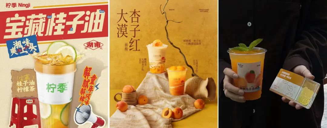 除應(yīng)季風(fēng)味外,今年“秋一杯”涌現(xiàn)出地域化創(chuàng)新。檸季推出湖南限定的“桂子油檸檬茶”,引入當(dāng)?shù)厝耸煜さ摹肮鹱佑汀保粫酂刹萃瞥鋈滤嵝酉盗小按竽幼蛹t”,邀請新疆藝人哈妮克孜代言;百分茶在“山野靈感|新疆季”中推出伊犁吊干杏冰茶,地域風(fēng)情滿滿。