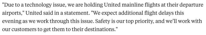 美聯(lián)航在聲明里提到,已暫停多個機場的航班。聲明稱“預(yù)計6日晚將有更多航班延誤,我們正在積極解決該問題。保障乘客的安全始終是首要任務(wù),我們會盡力協(xié)助旅客順利到達目的地”。
