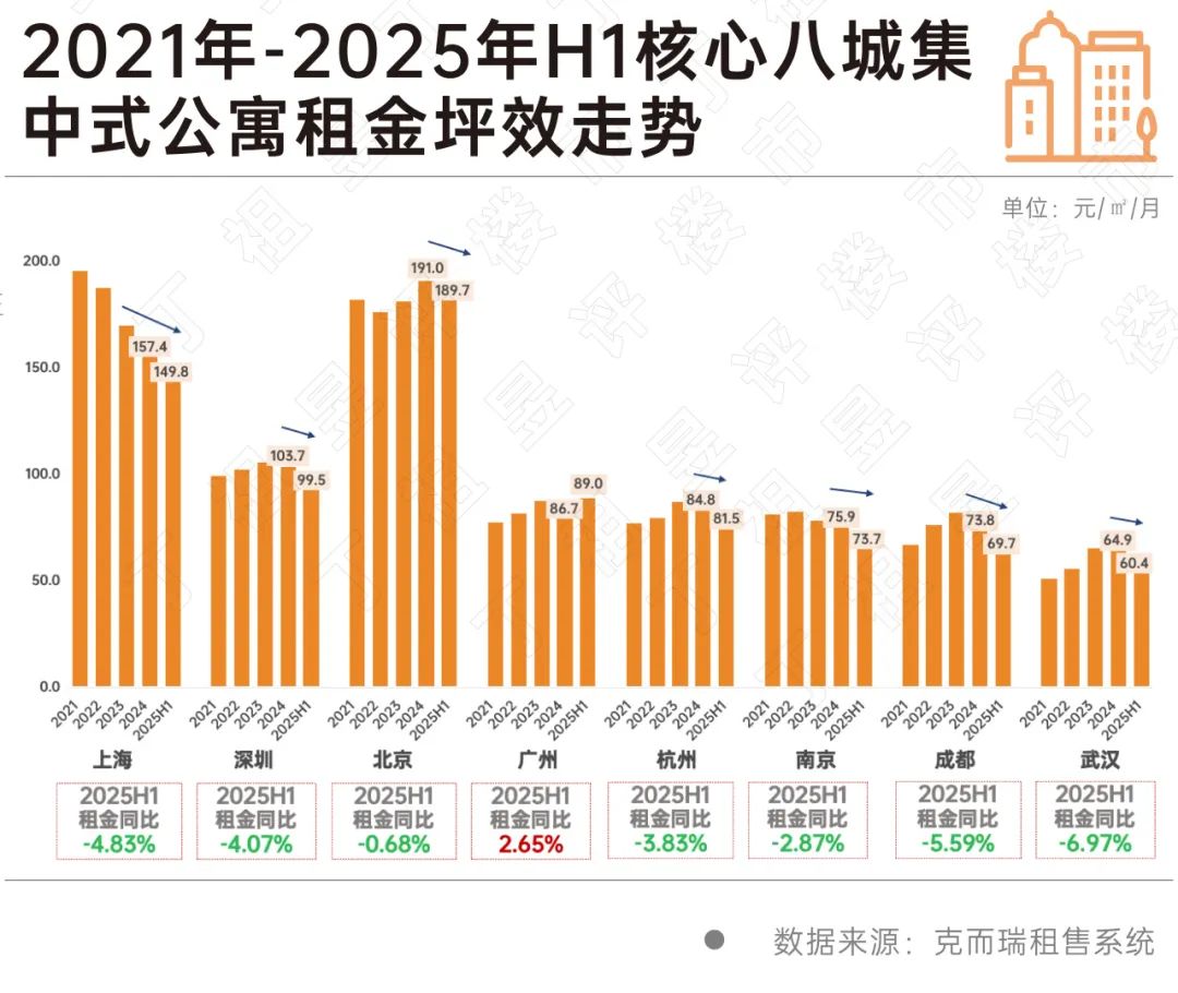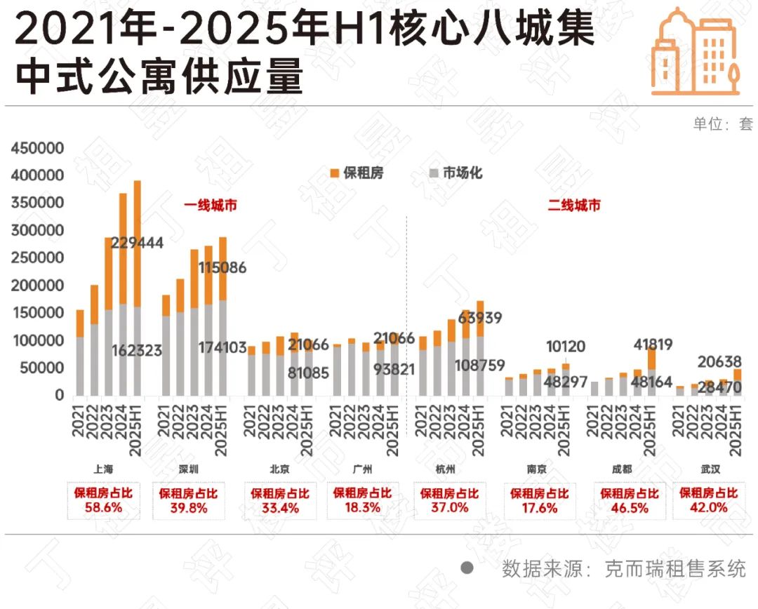 2025年上半年,集中式公寓供應(yīng)規(guī)模持續(xù)上升,核心八城集中式公寓供應(yīng)規(guī)模已超125萬(wàn)套,七城租金下滑,保租房占比高的四城跌幅更為明顯。