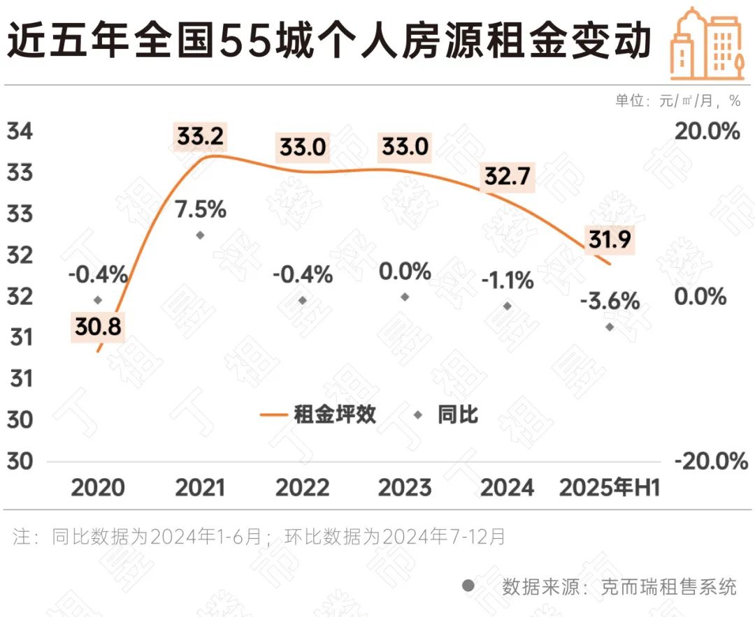 克而瑞長(zhǎng)租數(shù)據(jù)表明,2025年上半年全國(guó)55城整體個(gè)人房源租金坪效為31.9元/㎡/月,同比降幅3.6%,降幅較2024年同期擴(kuò)大1.2個(gè)百分點(diǎn)。這一數(shù)據(jù)既體現(xiàn)了租賃需求的疲軟,也暴露了市場(chǎng)供應(yīng)過(guò)剩的現(xiàn)狀。
