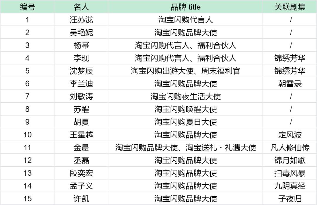 據(jù)統(tǒng)計(jì),淘寶閃購(gòu)的代言人有汪蘇瀧、吳艷妮、楊冪、李現(xiàn)、沈夢(mèng)辰、李蘭迪、劉敏濤、蘇醒、胡夏、王星越、金晨、丞磊、段奕宏、孟子義、許凱。