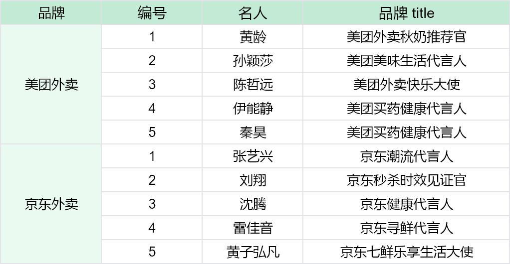 與之對(duì)比,今年美團(tuán)合作的5位明星包括黃齡、孫穎莎、陳哲遠(yuǎn)、伊能靜、秦昊;京東合作的5位明星為張藝興、劉翔、沈騰、雷佳音、黃子弘凡。