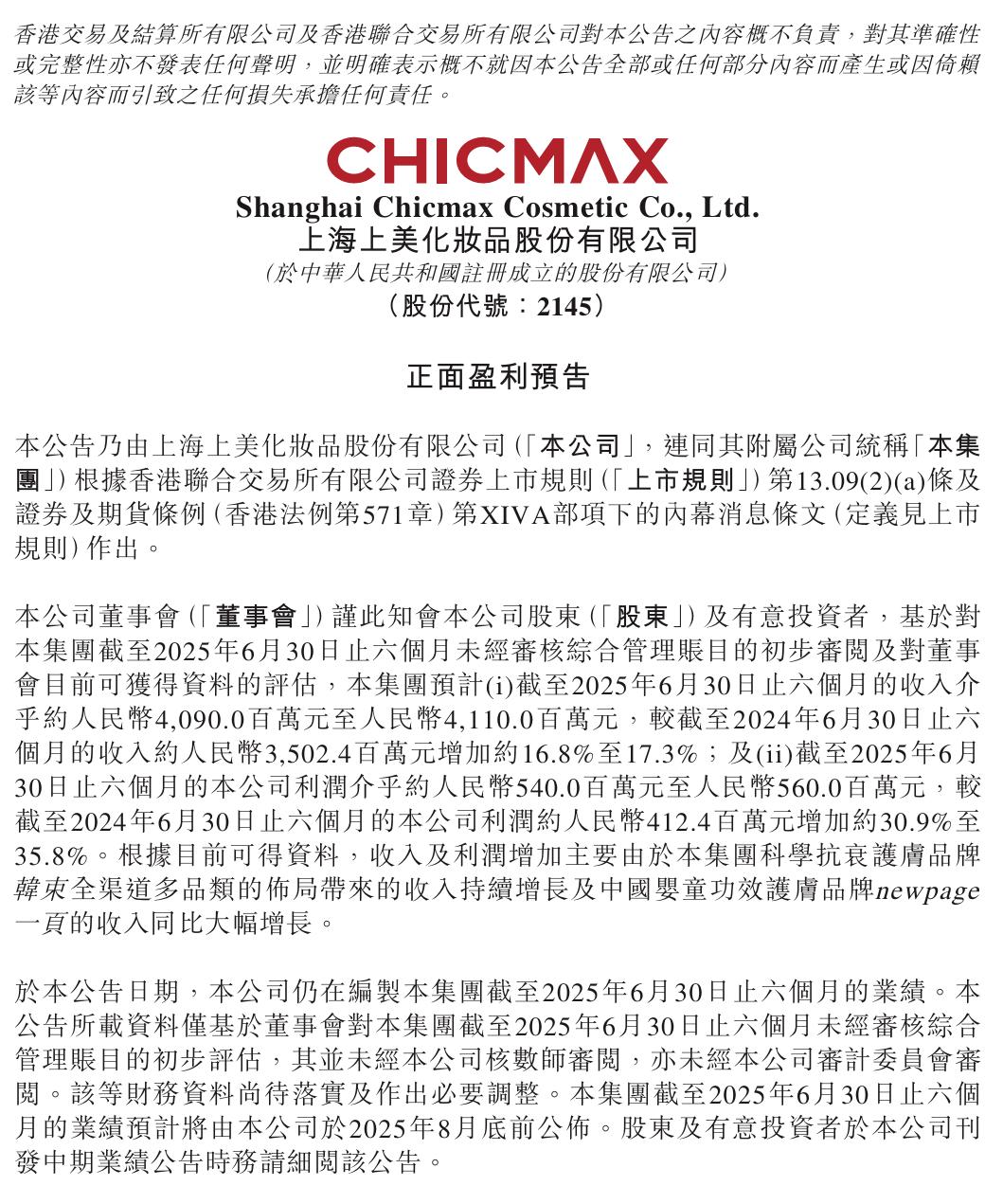 預(yù)告顯示,截至2025年6月30日的6個月,上美股份營收在40.9億 - 41.1億元之間,相較于去年同期的35.02億元,增長約16.8% - 17.3%;利潤在5.4億 - 5.6億元,較去年同期的4.12億元,增長約30.9% - 35.8%。