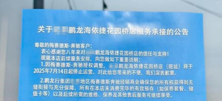 該店公告稱,因奔馳授權(quán)調(diào)整停止運(yùn)營,鵬龍行集團(tuán)某地區(qū)經(jīng)銷商會保障用戶權(quán)益,未消費完的預(yù)存服務(wù)可繼續(xù)享受,并給出了三個服務(wù)承接門店。